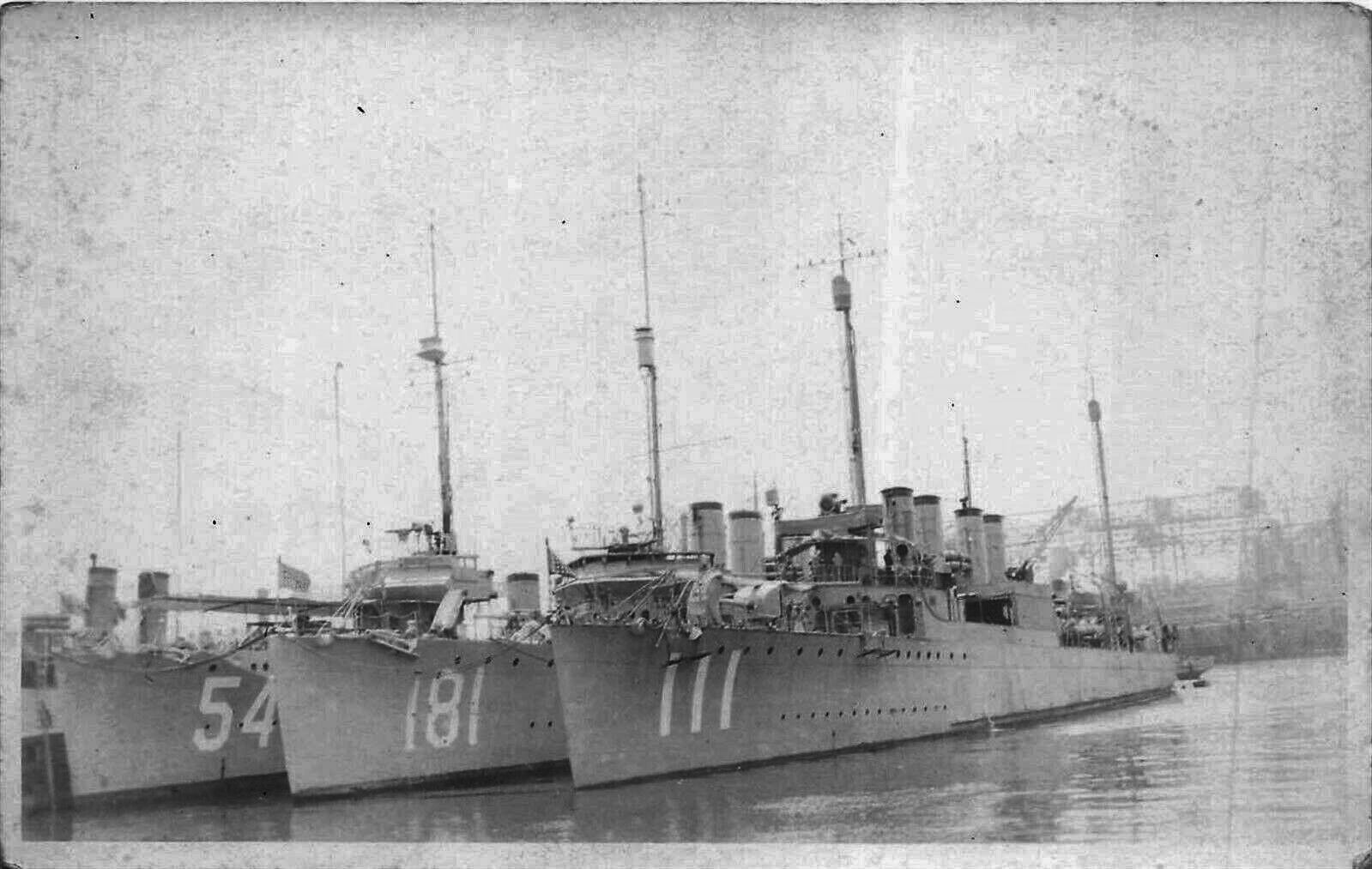 | 150k | McDougal (Destroyer No. 54), Hopewell (Destroyer No. 181) and Ingraham (Destroyer No. 111) moored together. This photo was probably taken at New York Navy Yard in summer 1919. Note Ingraham is missing her bridge. | Dave Wright |