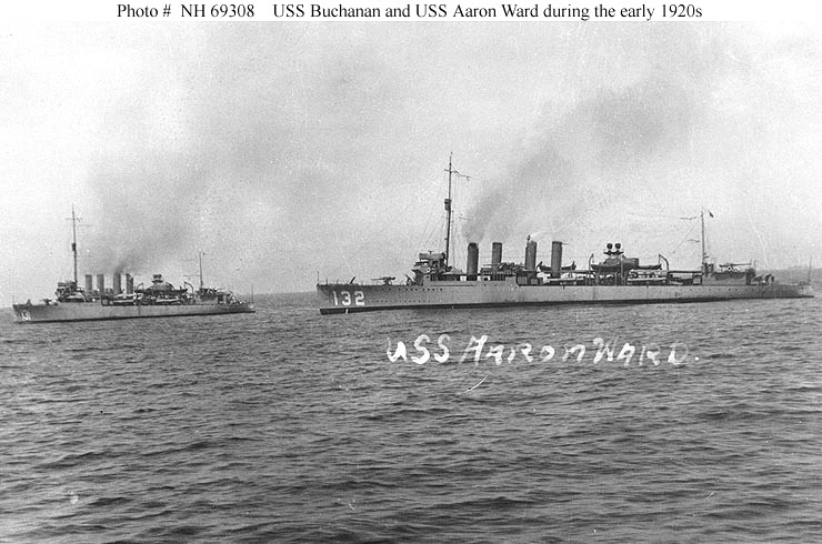 107k | USS Aaron Ward (DD-132) Photographed during the early 1920s, probably off the U.S. West Coast. USS Buchanan (DD-131) is at left. Courtesy of ESKC Joseph L. Aguillard, USNR, 1969. U.S. Naval Historical Center Photograph. | Fred Weiss |