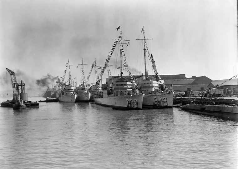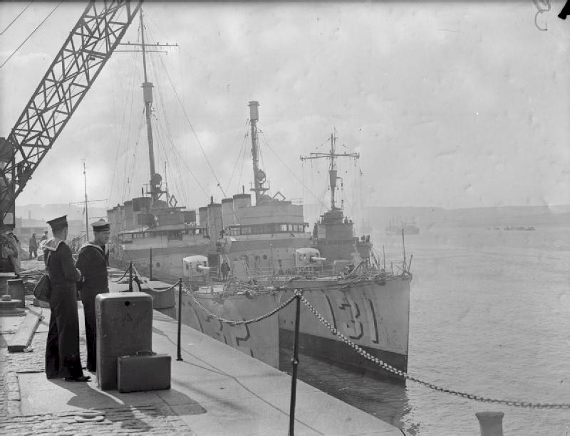 100k | HMS Castleton (ex-USS Aaron Ward, DD-132) along with HMS Clare (ex-USS Abel P. Upshur, DD-193) secure alongside a jetty after