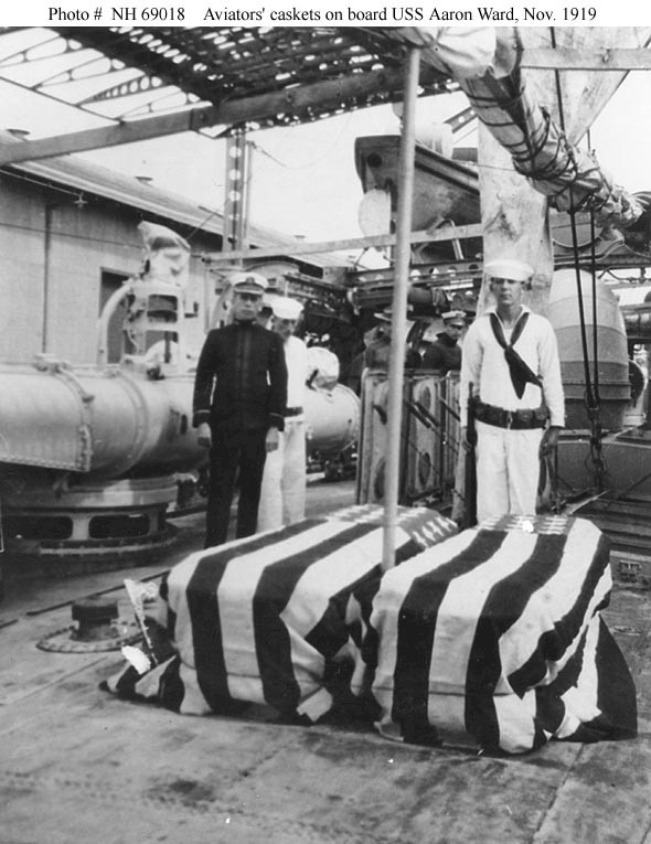 112k | USS Aaron Ward (Destroyer # 132) an officer and two sailors stand watch over the flag-draped caskets of Army Lieutenants Cecil H. Connolly and Waterhouse Weiser, on board the destroyer in November 1919. The two Army fliers were killed when their plane crashed while searching for other lost aviators in Mexico. Courtesy of the San Francisco Maritime Museum, San Francisco, California, 1969. U.S. Naval Historical Center Photograph. Photo #: NH 69018. | Robert Hurst |