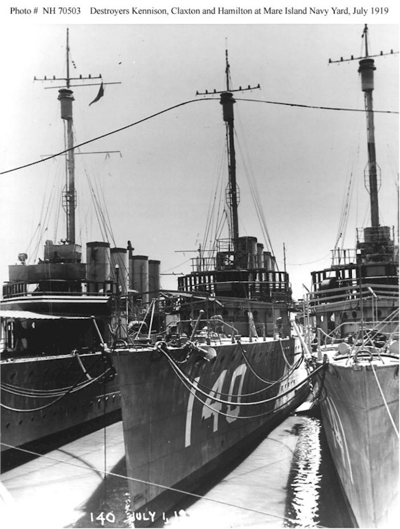 | 109k | USS Claxton (Destroyer # 140), Fitting out at the Mare Island Navy Yard, California, 1 July 1919. Two other destroyers, also fitting out, are on either side. USS Hamilton (Destroyer # 141) is at right, and USS Kennison (DD-138) is at left. Courtesy of the Mare Island Naval Shipyard, 1970. U.S. Naval History and Heritage Command Photograph. Photo #: NH 70503. | Robert Hurst |