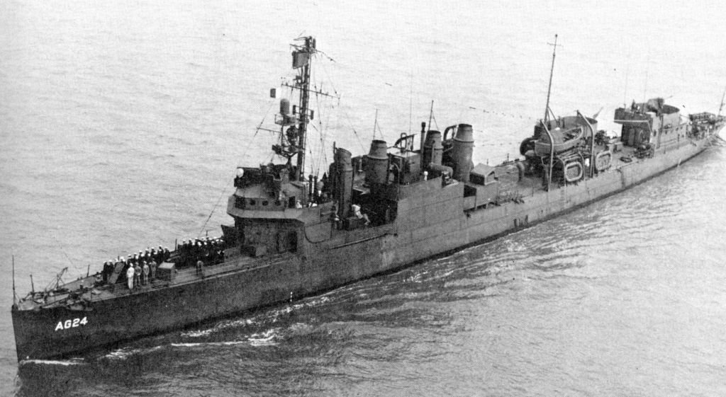 113k | Based on the East Coast from 1935 until her retirement after WW2, the Semmes was a sonar test ship during the late 30's and added escorting, training and anti-submarine patrols to her mission after the start of WW2, based out of Key West. She is shown here on April 12, 1945, off the Charleston Navy Yard, in her final configuration. Except for the single aft 3"/50 gun, she has had most of her original armament removed. In common with her anti-submarine role, she carries a Hedgehog forward, four depth charge throwers and her stern depth charge racks at the stern. She only carries a surface search radar, the new SU model. | - |