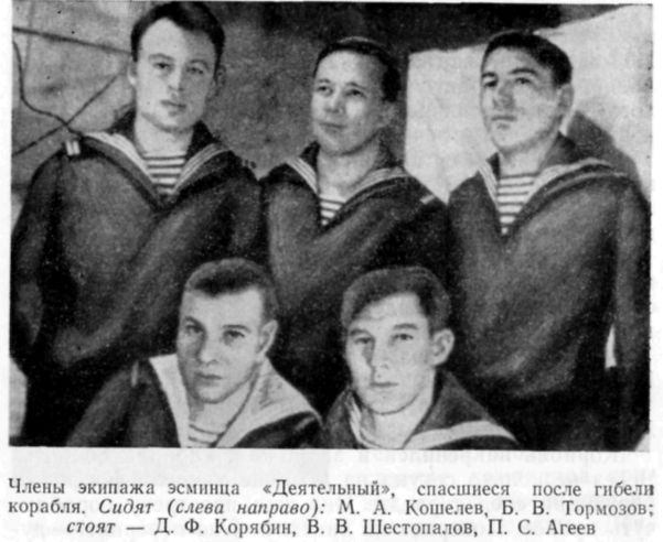 | 51k | Five of the seven survivors of Deyatel'niy's sinking. Seated: Motorist M.A. Koshelev, Boatswain Tormorzoy.