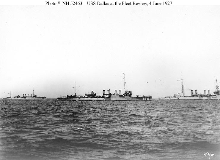 64k | Photo #: NH 52463, USS Dallas (DD-199) photographed during the Presidential Naval Review, 4 June 1927. USS Barry (DD-248) is in the left distance. Ship at right is an Omaha class light cruiser. U.S. Naval Historical Center Photograph. | Paul Rebold | |