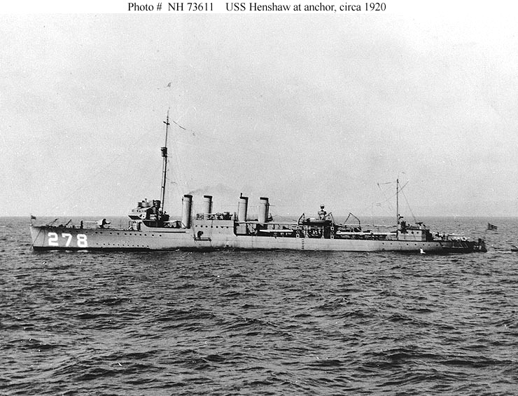 | 135k | USS Henshaw (DD-278) At anchor, circa 1920. Courtesy of Donald M. McPherson, 1971. U.S. Naval Historical Center Photograph. | Fred Weiss |