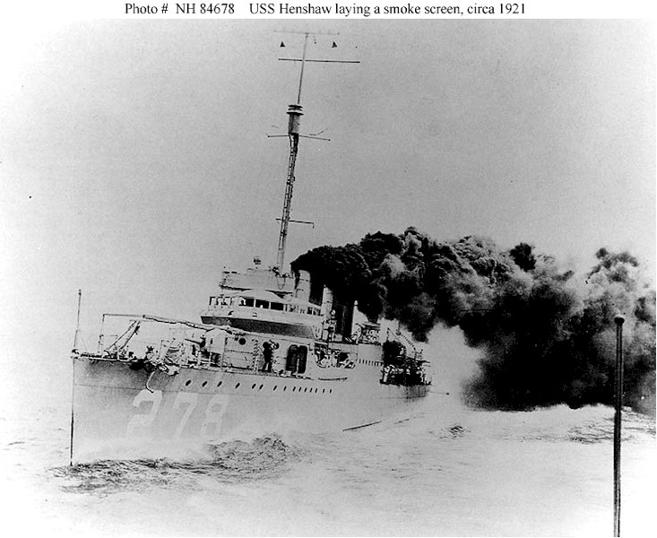 | 110k | USS Henshaw (DD-278) Laying a smoke screen, circa 1921. Courtesy of Donald M. McPherson, 1976. U.S. Naval Historical Center Photograph. | Fred Weiss |