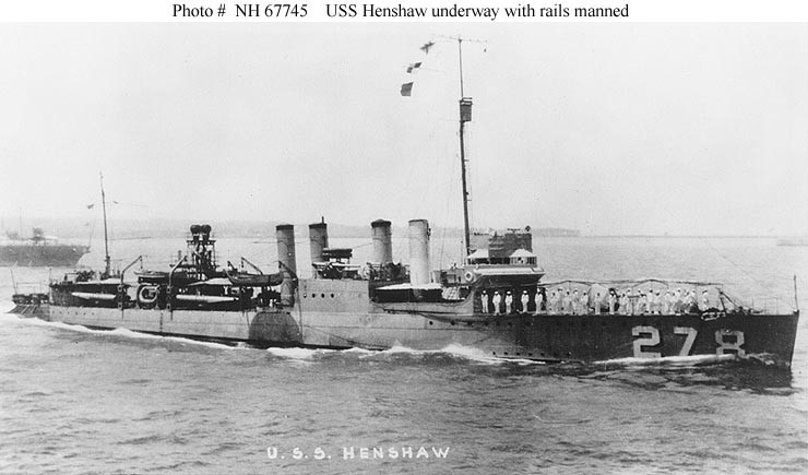 | 70k | USS Henshaw (DD-278) Underway in harbor, with her rails manned, during the middle or later 1920s. Courtesy of Donald M. McPherson, 1969. U.S. Naval Historical Center Photograph. | Fred Weiss |