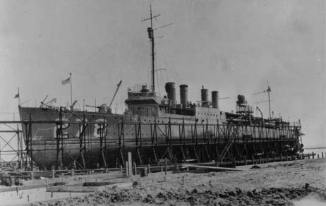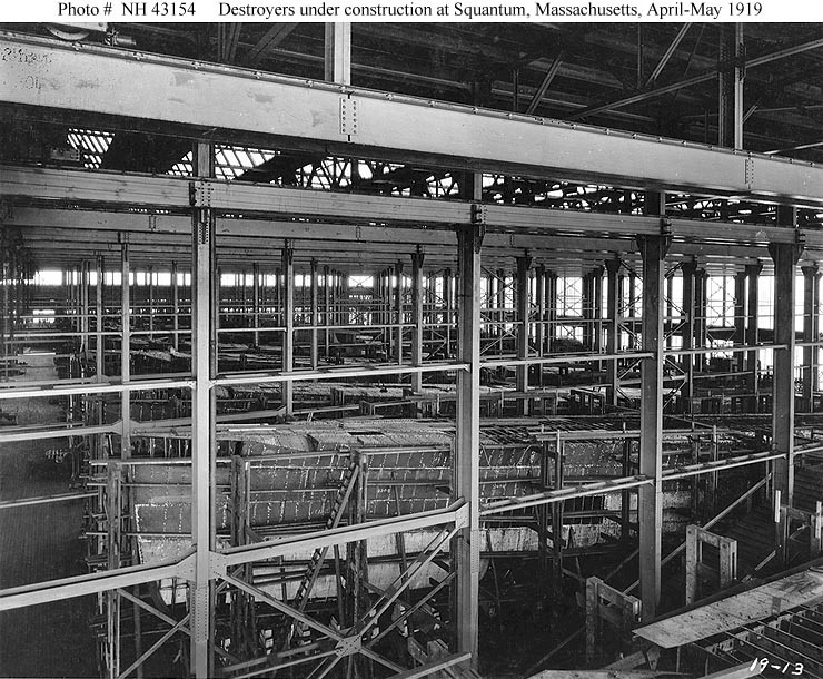 | 192k | Victory Destroyer Plant, Bethlehem Shipbuilding Corporation, Squantum, Massachusetts, interior of the building slips, photographed by Monks & Johnson, Boston, Massachusetts, between 27 April and 3 May 1919. The destroyers under construction in the foreground are, from the foreground: Meyer (Destroyer # 279, builder's # 359), Henshaw (Destroyer # 278, builder's # 358) and Moody (Destroyer # 277, builder's # 357). Beyond these three ships are at least three more, possibly McCawley (Destroyer # 276), Sinclair (Destroyer # 275) and Meade (Destroyer # 274). The unplated deck of Doyen (Destroyer # 280) is in the extreme right foreground. U.S. Naval Historical Center Photograph. Photo #: NH 43154. | Robert Hurst |