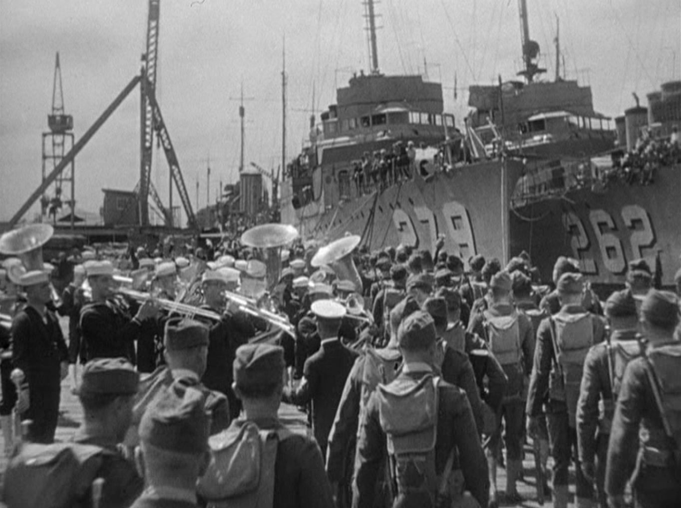 | 160k | Troops march to board transports in this still from the 1941 film The Fighting 69th. Given both Meyer and McDermut (DD-262) had long been scrap by the time the film was made, it's likely this is newsreel footage, perhaps from the 1920s Nicaraguan campaign. | John Dapper |