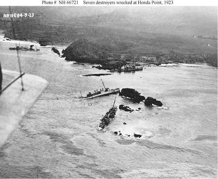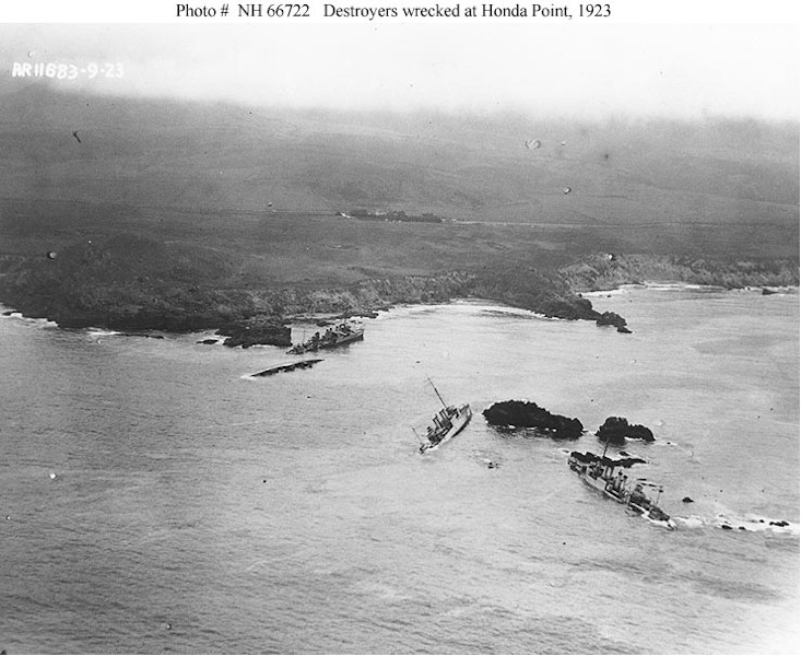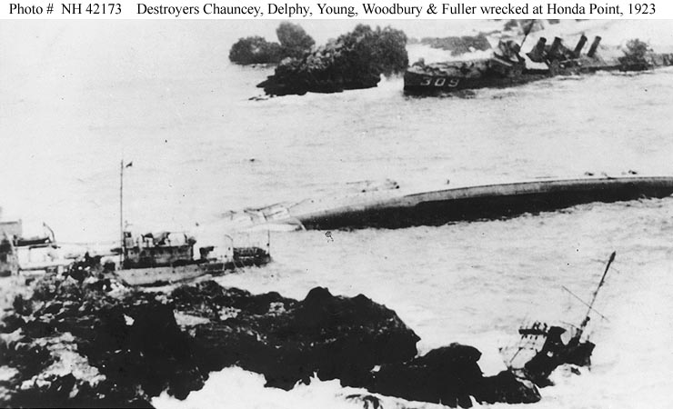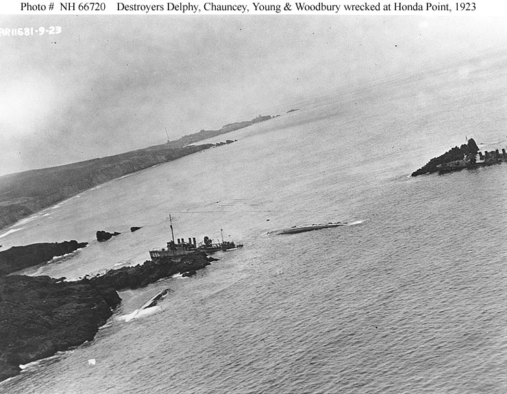 | 68k | Photo #: NH 66723: Honda Point Disaster, September 1923 , aerial view of the disaster area, showing the seven destroyers that ran aground in a fog during the night of 8 September 1923. Photographed from a plane assigned to USS Aroostook (CM-3). Ships are: USS Nicholas (DD-311), in the left center; USS S.P. Lee (DD-310), astern of Nicholas; USS Delphy (DD-261), capsized in small cove (center); USS Young (DD-312), capsized in the center of the view; USS Chauncey (DD-296), upright ahead of Young; USS Woodbury (DD-309) on the rocks in the center; and USS Fuller (DD-297), closest to the camera. Courtesy of the Naval Historical Foundation. Collection of Admiral William V. Pratt. U.S. Naval Historical Center Photograph. | USN courtesy of Joe Radigan |