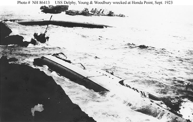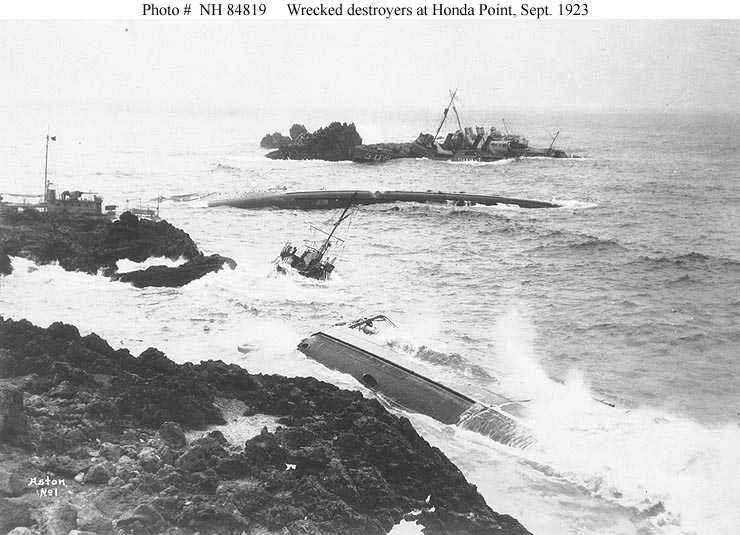 | 59k | Photo #: NH 42172: Honda Point disaster, September 1923, ships of Destroyer Squadron Eleven wrecked on the California coast, near the northern entrance of the Santa Barbara Channel, shortly after they ran aground in the fog during the night of 8 September 1923. USS Delphy (DD-261) is in the foreground, capsized. Beyond her, also capsized, is USS Young (DD-312). USS Woodbury (DD-309) is on the rocks in the middle distance, with USS Fuller (DD-297) partially visible beyond her. Donation of BMGC Ralph E. Turpin, 1963. U.S. Naval Historical Center Photograph. | Fabio Peña |