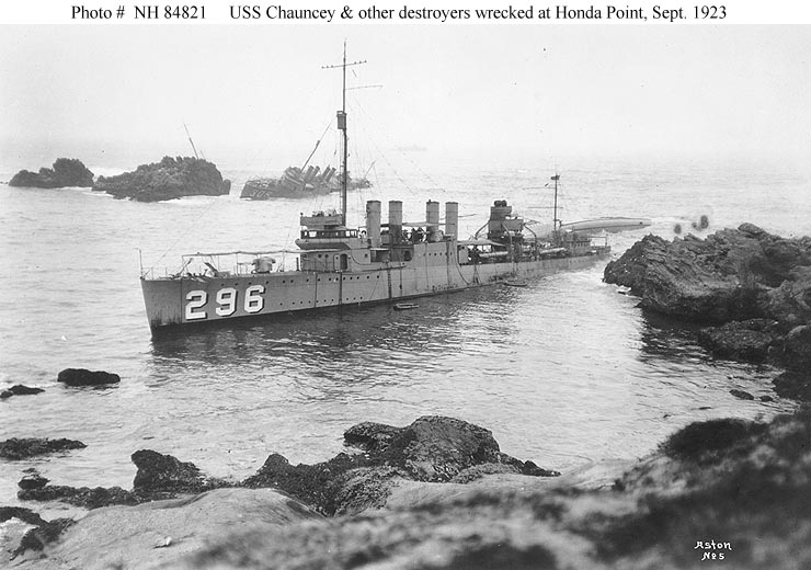 | 84k | Photo #: NH 84821: Honda Point Disaster, September 1923, wrecked destroyers on Honda Point, California, soon after the night of 8 September 1923, when they went ashore in a fog. In the foreground is USS Chauncey (DD-296), with life rafts in the water alongside. USS Young (DD-312) is capsized astern of Chauncey. In the distance is USS Woodbury (DD-309), heeled to port with her bow near a small rock island. USS Fuller (DD-297) is barely visible behind that island. Photograph by Aston. Donation of Captain George M. Grening, USN (Retired). U.S. Naval Historical Center Photograph. | Fabio Peña |