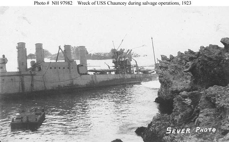 | 77k | Photo #: NH 97982: Honda Point Disaster, September 1923, wreck of USS Chauncey (DD-296) near shore, during salvage operations some time after 8 September 1923, when she went aground on Honda Point with six other destroyers. Sheer legs are rigged atop her galley deckhouse to assist in removing items from the ship. Her midships 4"/50 guns have already been sent ashore. The wreck of USS Woodbury (DD-309) is in the middle distance. Photographed by Sever. Collection of Lieutenant Kelly Green. U.S. Naval Historical Center Photograph. | Fabio Peña |