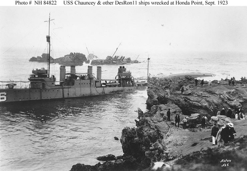 60k | Photo #: NH 42173: Honda Point disaster, September 1923, ships of Destroyer Squadron Eleven wrecked on the California coast, near the northern entrance of the Santa Barbara Channel, shortly after they ran aground in a fog during the night of 8 September 1923. The stern of USS Delphy (DD-261) is in the right foreground. At left is USS Chauncey (DD-296). Beyond her stern is the capsized USS Young (DD-312). USS Woodbury (DD-309) is on the rocks in the upper right, with USS Fuller (DD-297) partially visible behind her. Donation of BMGC Ralph E. Turpin, 1963. U.S. Naval Historical Center Photograph. | Fabio Peña |
