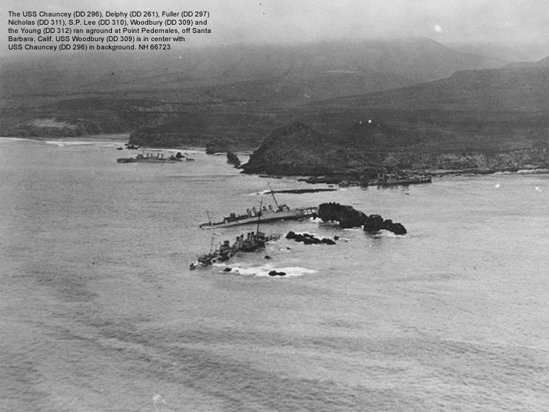 | 146k | Honda Point Disaster, September 1923, from top to bottom the wrecks of the USS Fuller (DD-297), USS Woodbury (DD-309), USS Young (DD-312) and USS Chauncey (DD-296). Copyright Bunnell Photo Shop, San Diego, CA. From the collection of CPO A. F. Meehan USN (Ret.). | Pam Mayfield |