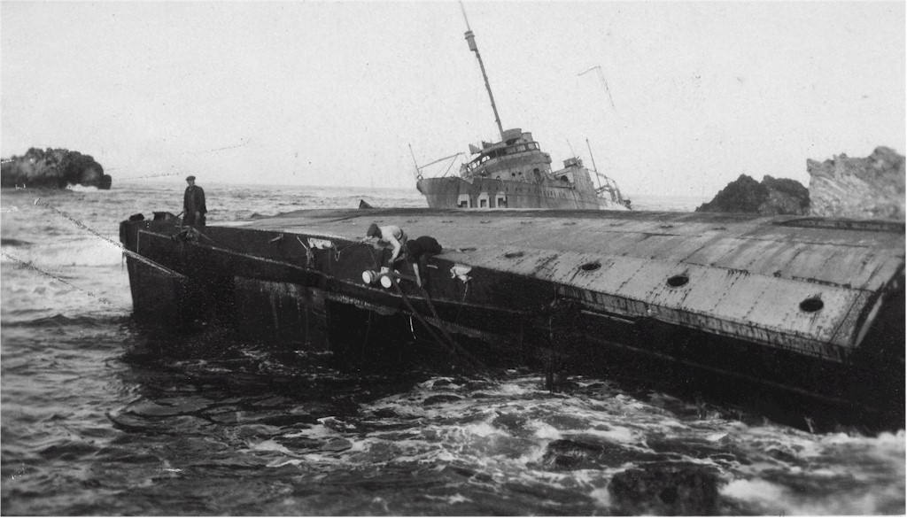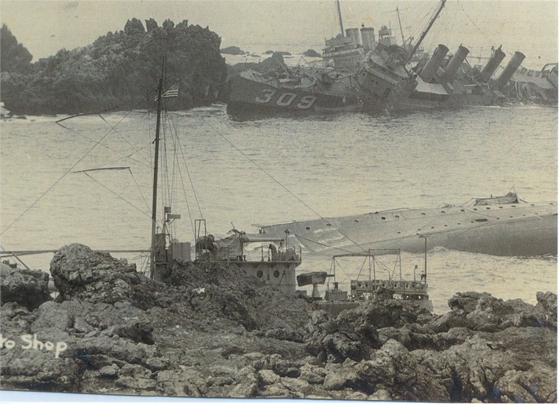 USS Delphy (DD-261), capsized in small cove (center); USS Young (DD-312), capsized in the center of the view; USS Chauncey (DD-296), upright ahead of Young; USS Woodbury (DD-309) on the rocks in the center; and USS Fuller (DD-297), closest to the camera. Courtesy of the Naval Historical Foundation. Collection of Admiral William V. Pratt. U.S. Naval Historical Center Photograph. | Fabio Peña |