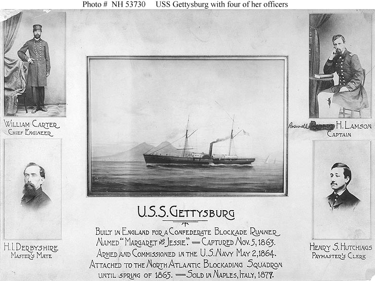 USS Gettysburg (1864-1879) montage featuring a painting of the ship (by De Simone, Naples, 1878) and views of four officers who served in her in 1864-1865. The officers are (clockwise from upper right): Lieutenant Roswell H. Lamson, Commanding Officer; Henry S. Hutchings, Paymaster's Clerk; Acting Master's Mate H.J. ("I" ?) Derbyshire; and Acting 3rd Assistant Engineer Enoch B. Carter (probably - there is no Engineer named "William Carter" in contemporary Navy Registers). Naval History & Heritage Command photo NH 53730 | Bill Gonyo |