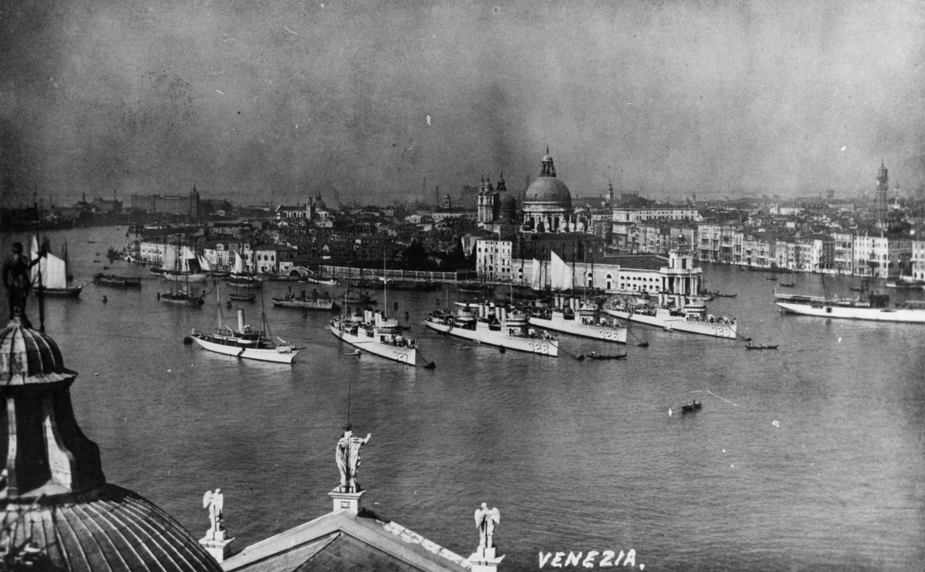 | 699k | Ships of Destroyer Division 27 moored with several yachts and other vessels off Venice, 3 April 1926. The destroyers are (from left centre to right centre): USS Preston (DD-327); USS Lamson (DD-328); USS Coghlan (DD-326) and USS Bruce (DD-329) USN Photo No NH86200. | Robert Hurst |