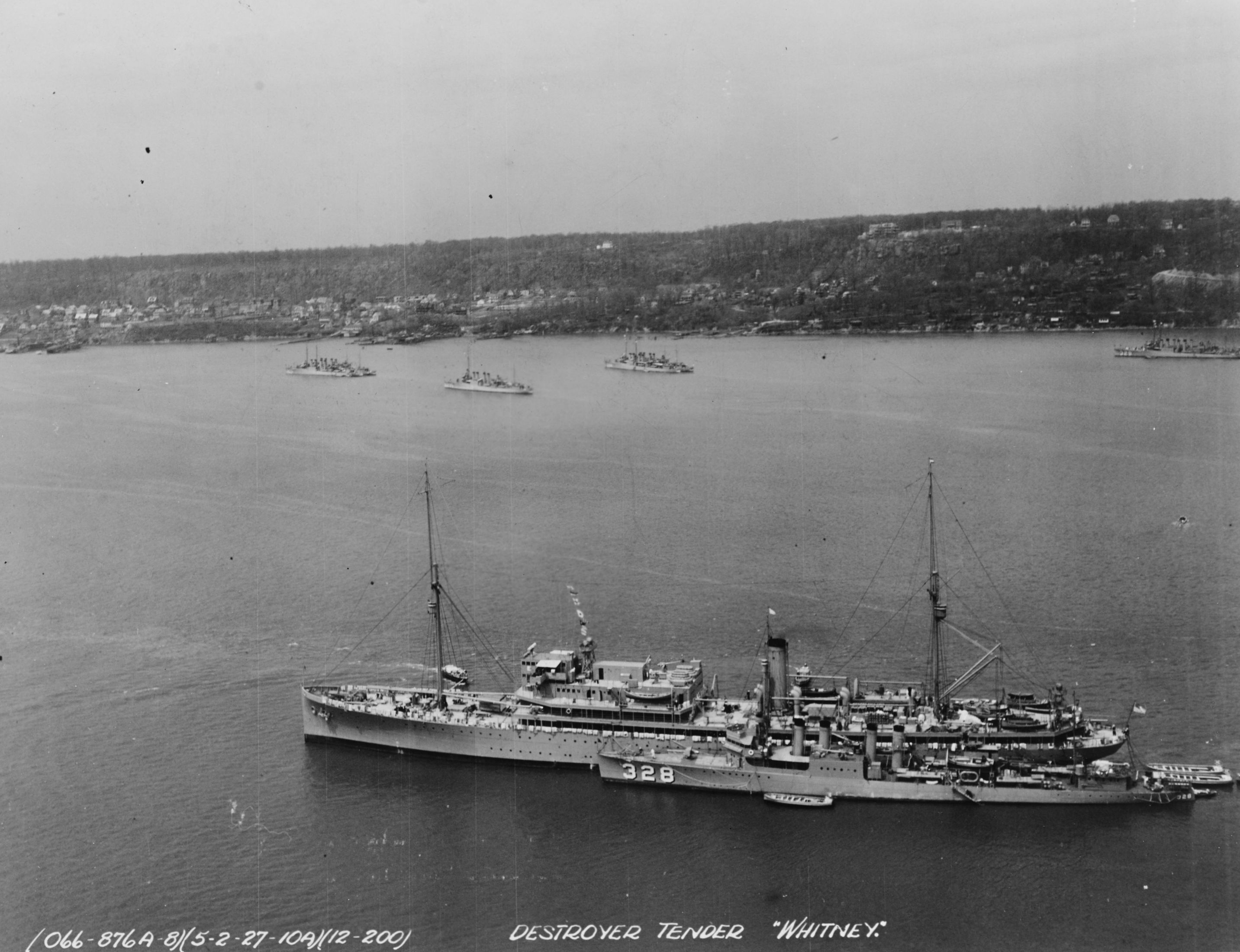 573k | USS Whitney (AD-4) with USS Lamson (DD-328) alongside in the Hudson River, New York, at 1000 hours, 02 May 1927. Several other destroyers are in the background, among them USS Bruce (DD-329) at right. U.S. Naval Historical Center Photograph. | Fred Weiss |