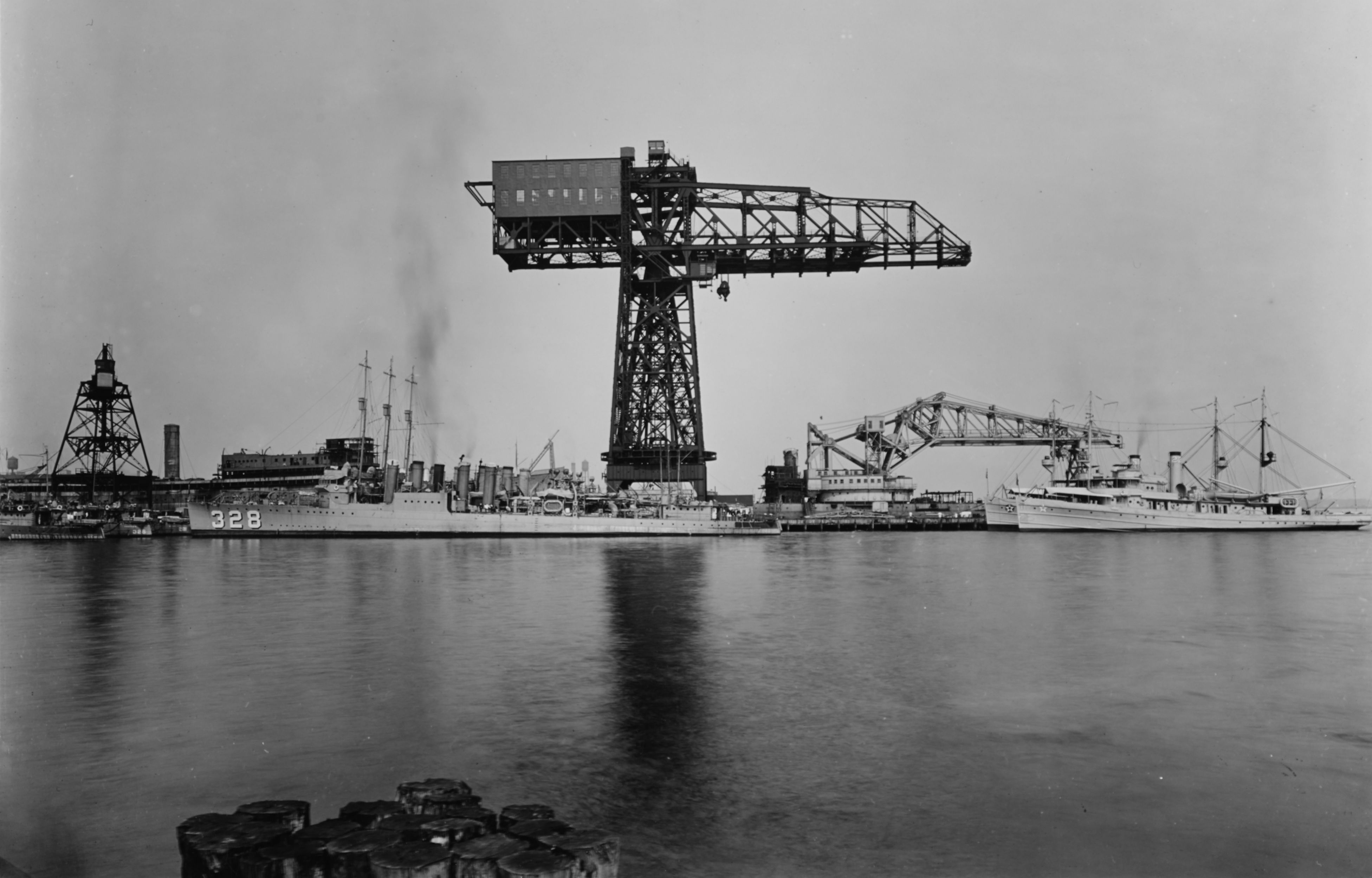 599k | Delaware River waterfront of Philadelphia Navy Yard, with the hammerhead crane in center, 31 May 1923. Among the ships visible are: USS Lamson (DD-328), in left center; USS Sandpiper (AM-51) and USS Teal (AM-23), at right, with the crane ship Kearsarge (AB-1) beyond; Destroyers Preston (DD-327), Coghlan (DD-326) and Sharkey (DD-281), partially visible at left. USS Dobbin (AD-3) is fitting out on the opposite side of the pier, at left.