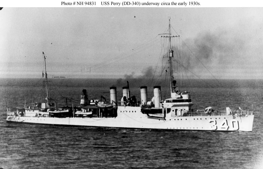 | 115k | USS Perry (DD-340) underway at sea, circa the early 1930s. Courtesy of Chief Photographer's Mate John Highfill, USN (Retired). U.S. Naval History and Heritage Command Photograph. Photo #: NH 94831. | Robert Hurst | |