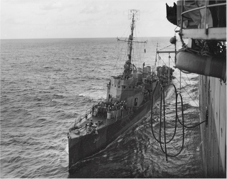 Two views of Decatur (DD-341) coming alongside and refueling from USS Bennington (CV-20) in October-November 1944. They were taken by Lowell Love, a photographer aboard Bennington. | Steve Whitby |