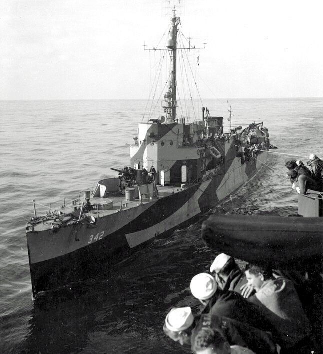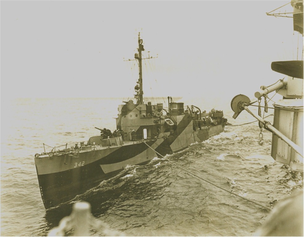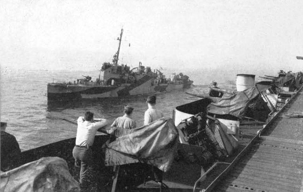 78k | USS Hulbert (DD-342) seen from escort carrier USS Takanis Bay (CVE-89), circa 1945. Hulbert served as a plane guard destroyer for Takanis Bay during flight training off the coast of California. She wears Camouflage Measure 31, Design 21D. US Navy photo from the USS Takanis Bay (CVE-89) World War II cruise book | Robert Hurst |