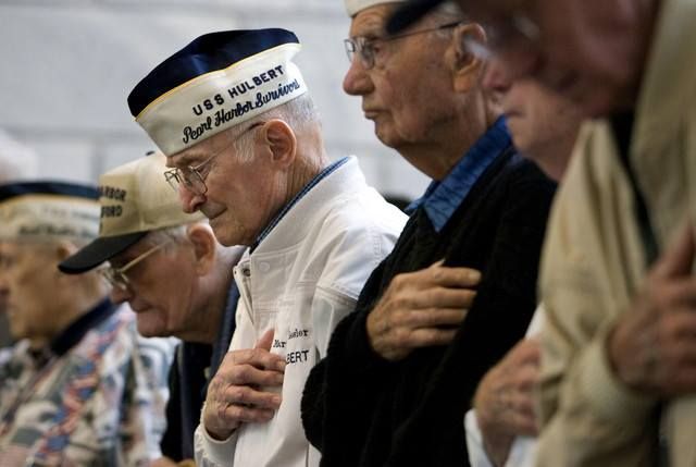 | 35k | On 07 December 1941, Seaman 2nd class Marion Ray Kesler, a cook's helper, was standing on the deck of Hulbert at the Submarine Base at Pearl Harbor, talking with the cook, Wally Martenson, when they heard and saw the Japanese planes "coming in out of the sun". As the ship's alarm didn't work, Kesler ran below to tell the crew, who just laughed at him. That is, until the deck antiaircraft batteries above them opened up. Kesler spent the rest of that morning's attack loading .50-caliber cartridges into a belt that was then fed into the machine gun. In the photo, Kesler (third from left, with the hat clearly marked Hulbert) and other survivors listen as Taps is played during the Pearl Harbor Day ceremony in the rotunda of the Utah State Capitol on Wednesday, 07 December 2011.