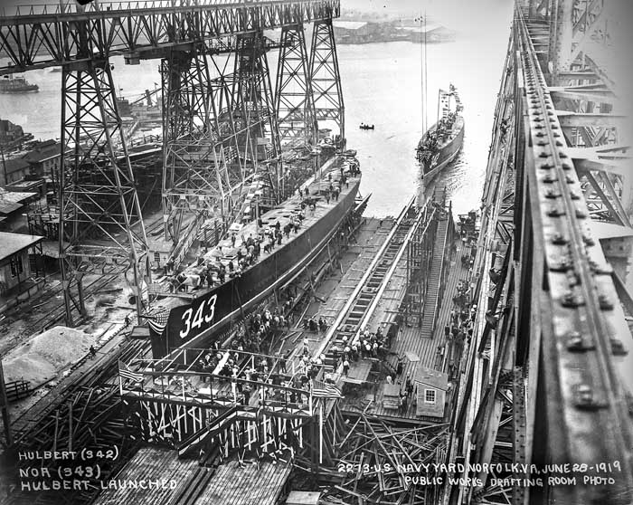 | 73k | Launching of Hulbert (Destroyer No. 342) at Norfolk Navy Yard, 28 June 1919. Noa (Destroyer No. 343) is soon to follow down the ways.