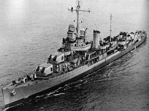 | 46k | Bow overhead view of the Moffett on October 28, 1942. Presence of #3 5-inch SP mount indicates that this photo was taken prior to mid-war Porter class standard modifications. At this time, #3 mount was replaced by a quadruple 40 mm mount, along with the fore and aft 1.1”/75 machine cannons being replaced with twin 40 mm mounts. Photo from the 1943-45 Naval Recognition Manual files. | Mike Green |
