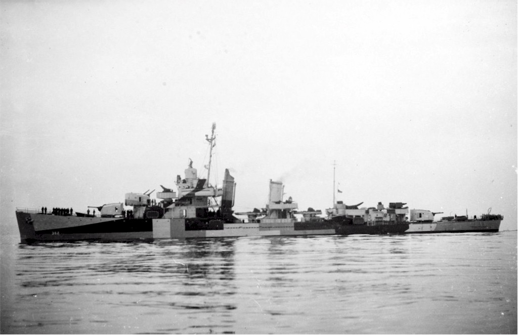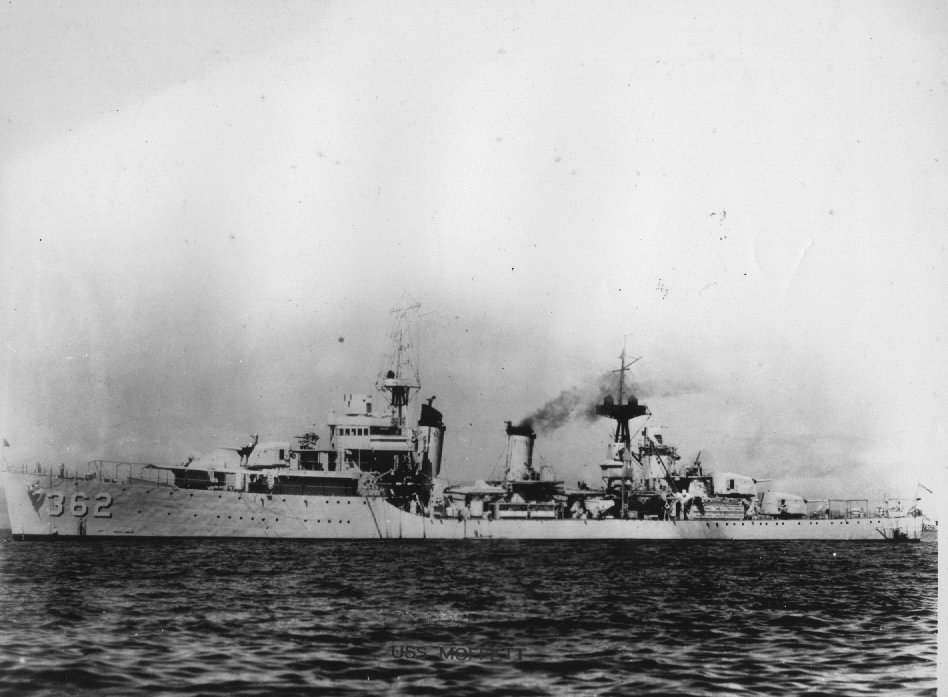 | 173k | USS Moffet (DD-362) Photo taken July 13, 1944 off Hampton Roads, Virginia showing the standard mid-war Porter class configuration. Modifications include replacement of the 1.1/75 cannons fore and aft with twin 40mm mounts, #3 5" twin mount replaced by a quadruple 40mm mount. Due to top weight problems in this class, something had to give when additions were made. She only carries four depth charge throwers and the 20mm guns were unshielded. HF/DF mainmast is consistent with the convoy flagship/squadron leader role of the Porter class. | - |