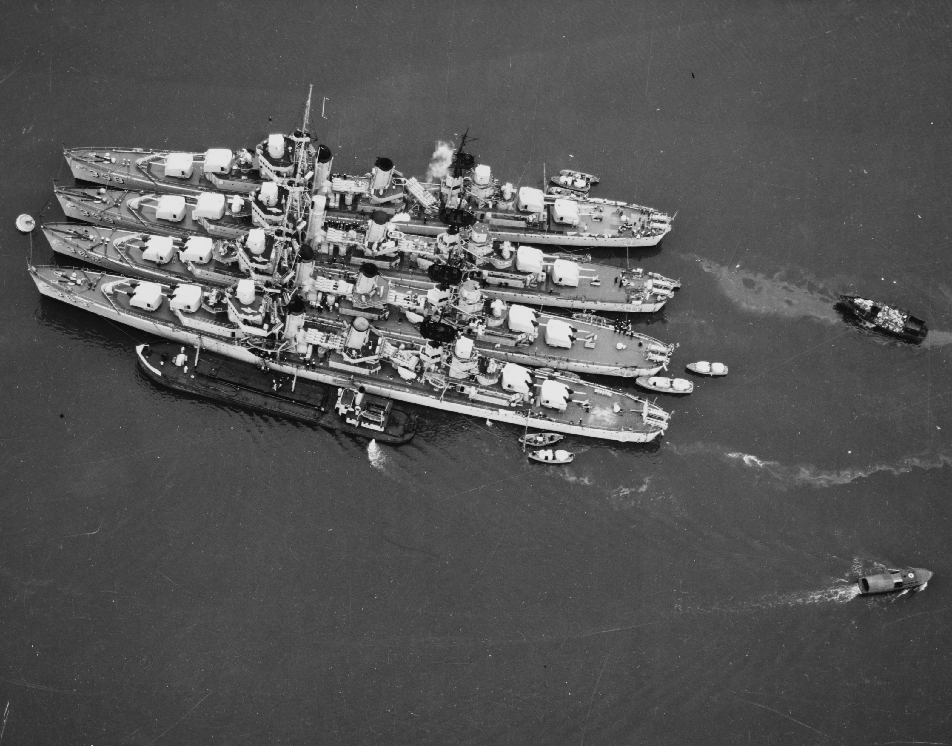| 93k | USS Balch (DD-363), USS Moffett (DD-362), USS Winslow (DD-359), and USS McDougal (DD-358) (listed from bottom to top) moored together at San Diego, California, March 1939. A harbor oiler is alongside Balch, and what appears to be a garbage lighter is astern of the four destroyers. Official U.S. Navy Photograph, now in the collections of the National Archives. | Fred Weiss |