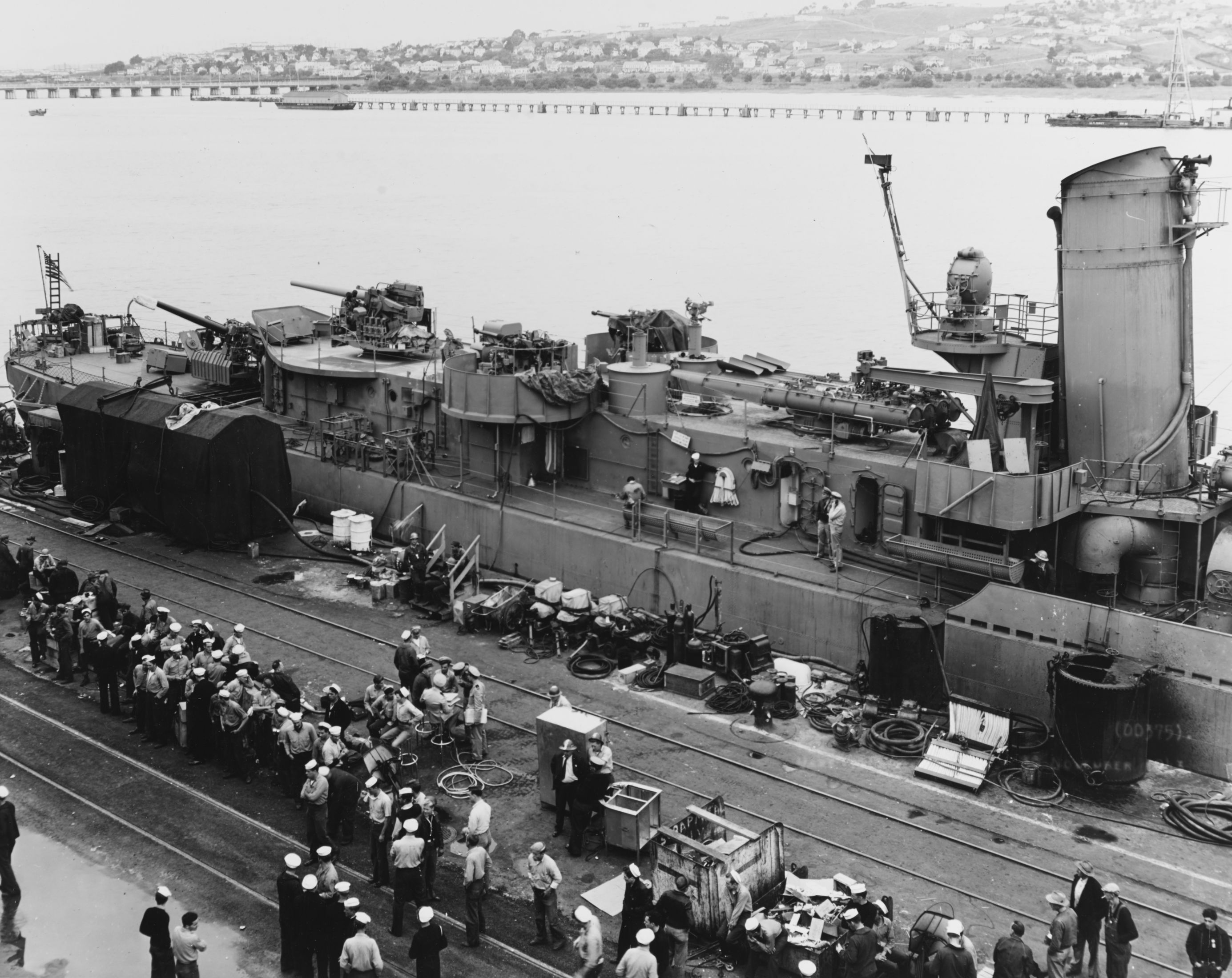 | 633k | USS Downes (DD-375) ship's after portion, photographed from off her starboard side at the Mare Island Navy Yard, California, 30 November 1943.