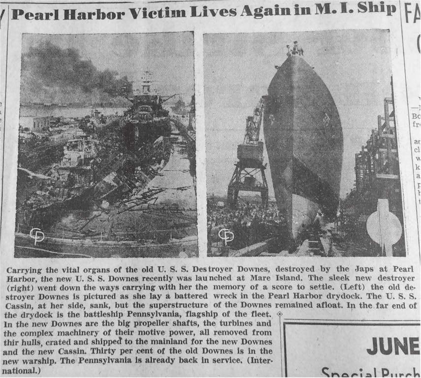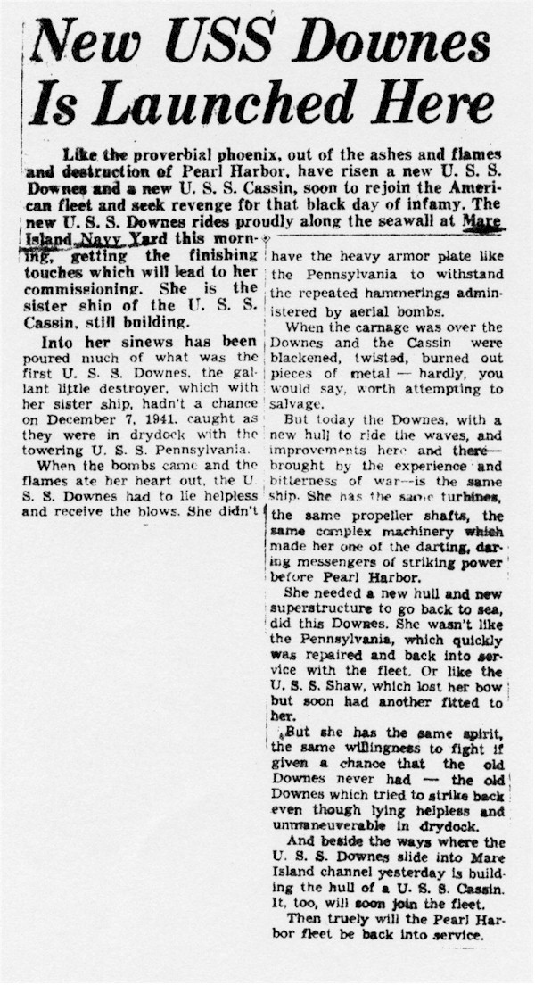 | 260k | The Vallejo Evening News-Chronicle issue of 25 May 1943 reporting the launching of the rebuilt USS Downes (DD 375) at Mare Island. | Darryl Baker |