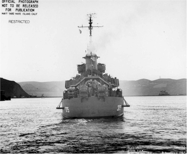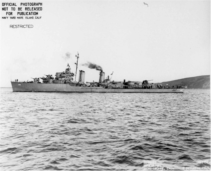 | 95k | Navy Photo 8117-43, stern view of the new USS Downes (DD-375) departing Mare Island, 08 December 43. Work started on her construction on 08 October 42; she departed Mare Island for the final time on 14 December 1943. | Darryl Baker |