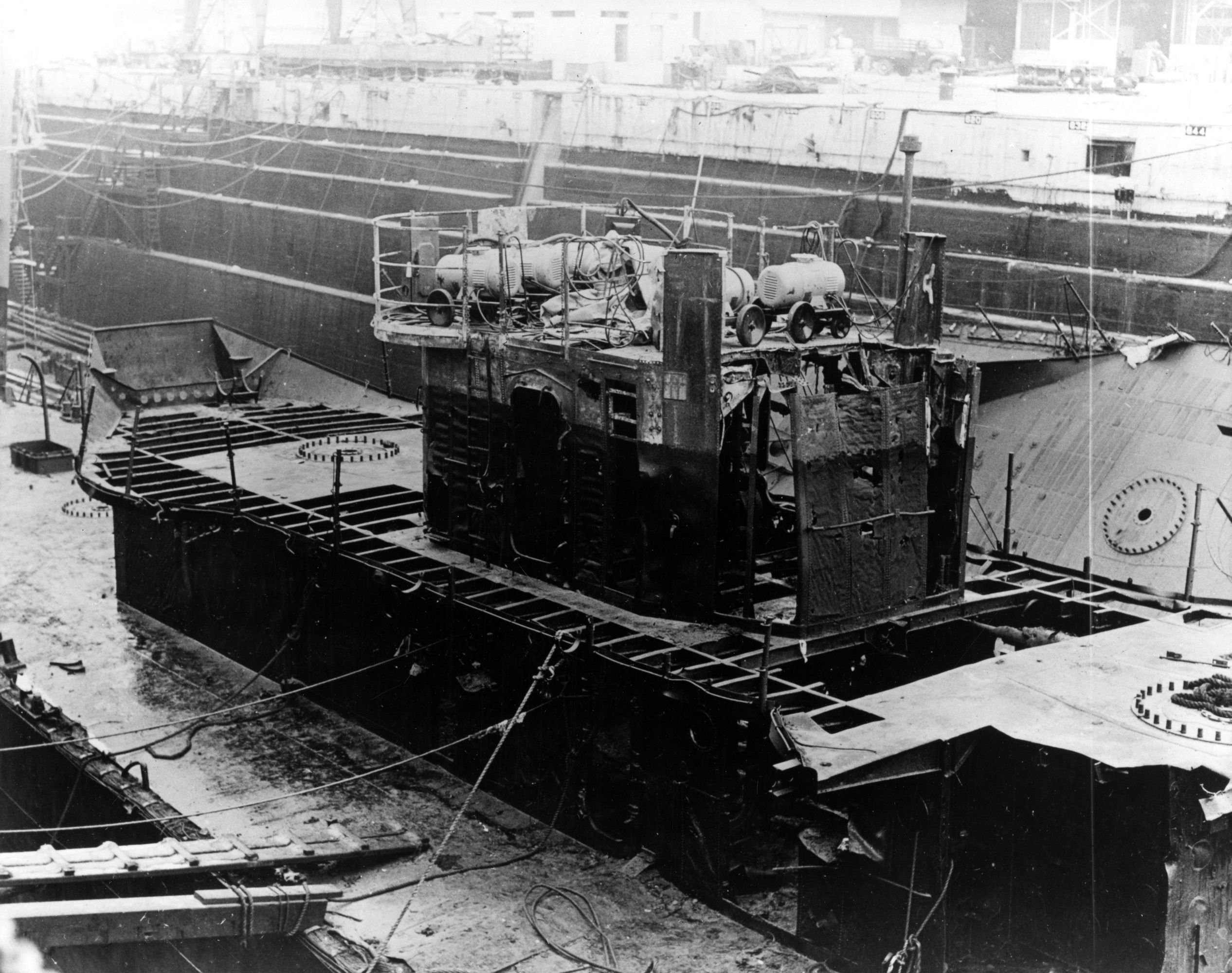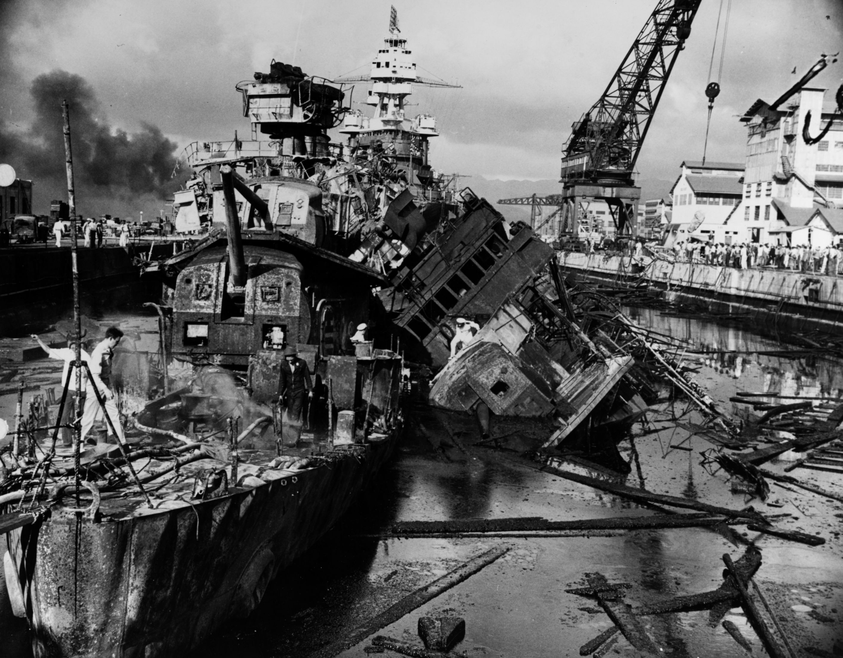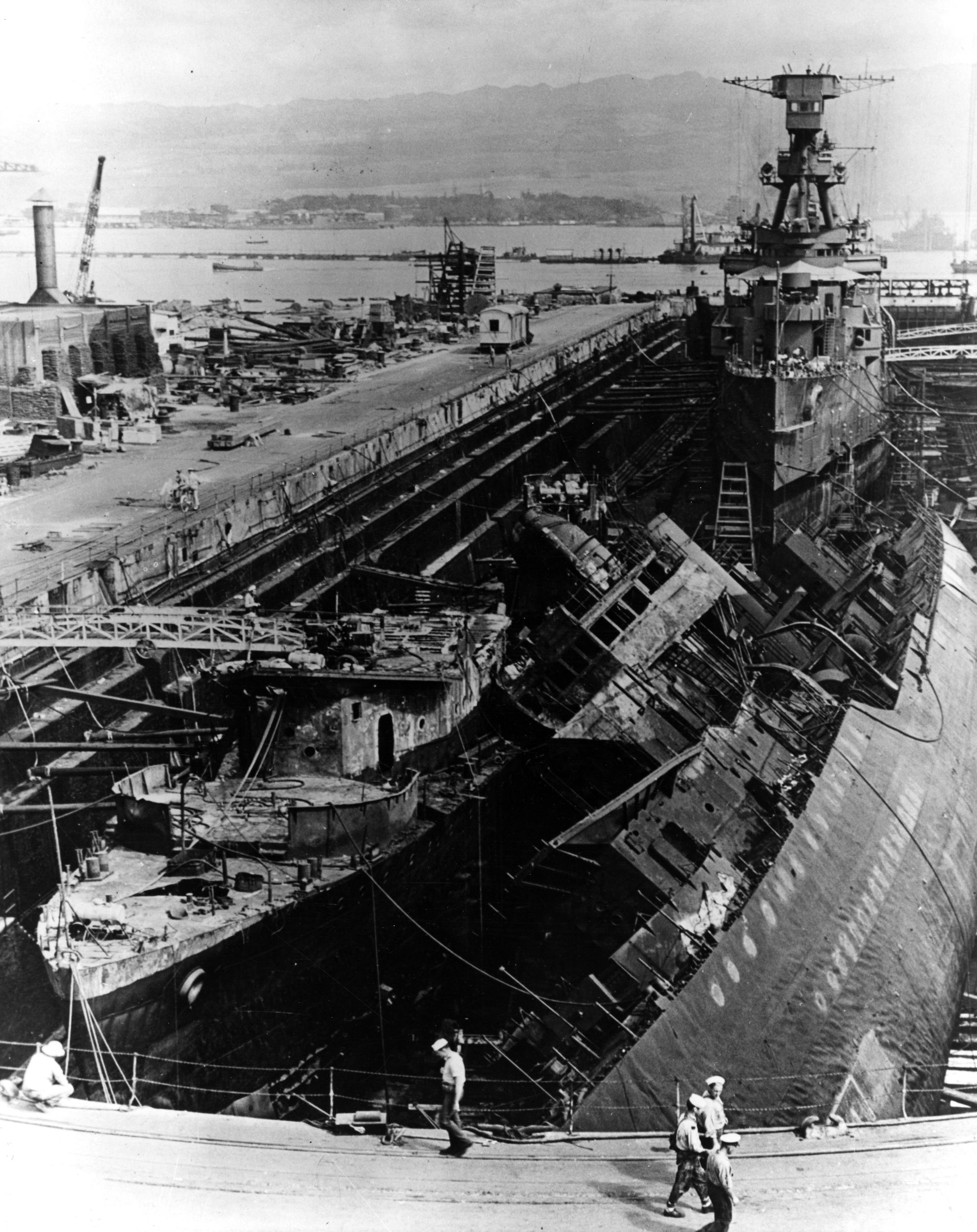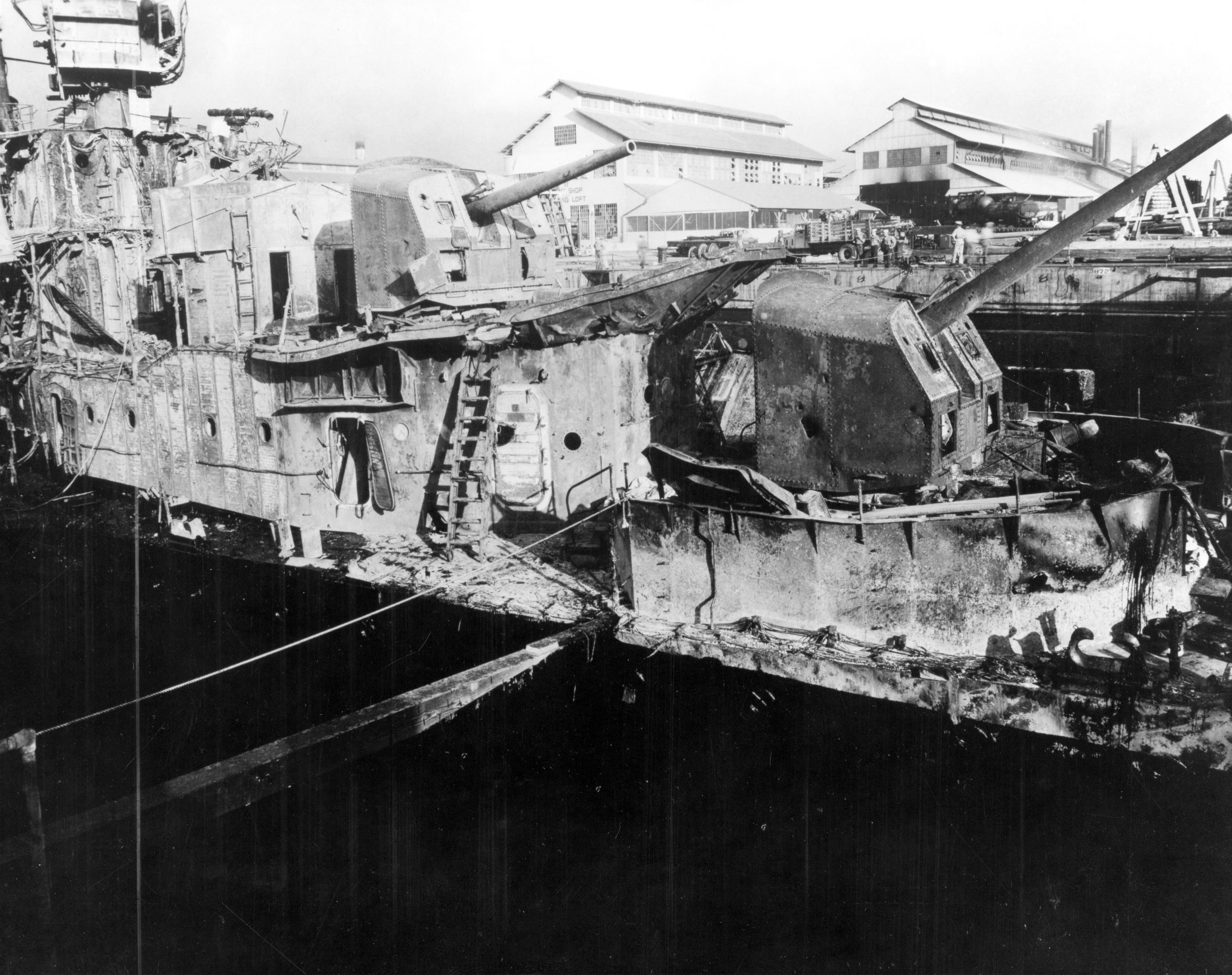 | 760k | USS Cassin (DD-372) (capsized, right) and USS Downes (DD-375) (left), in Drydock Number One at the Pearl Harbor Navy Yard, 07 December 1941, immediatly following the Japanese attack. Both ships had been severely damaged by bomb hits and the resulting fires. In the background, also in Drydock Number One, is USS Pennsylvania (BB-38), which had received relatively light damage in the raid.