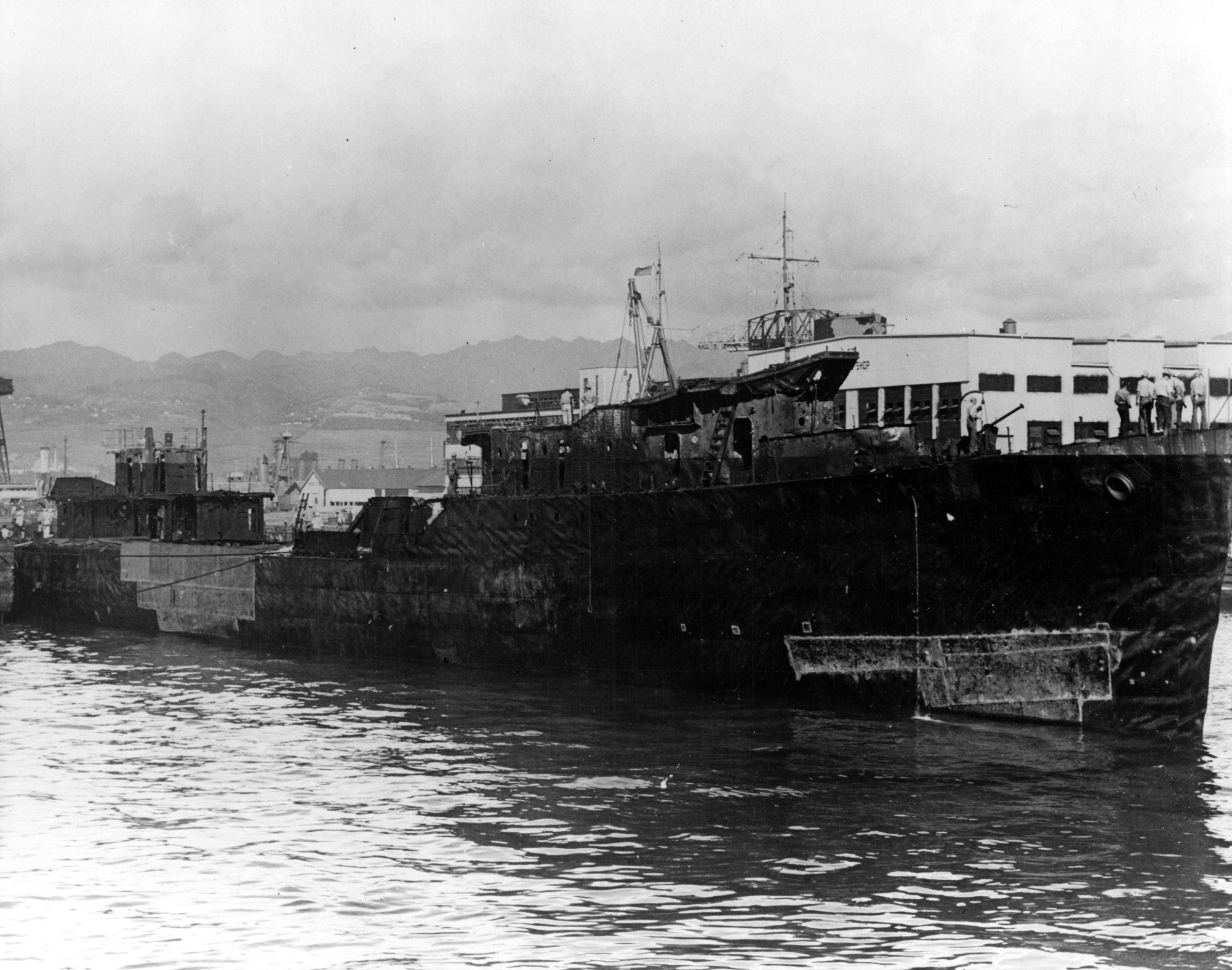 | 600k | USS Downes (DD-375), at left, and USS Cassin (DD-372), capsized at right, burned out and sunk in the Pearl Harbor Navy Yard drydock on 07 December 1941, after the Japanese attack. The relatively undamaged USS Pennsylvania (BB-38) is in the background.