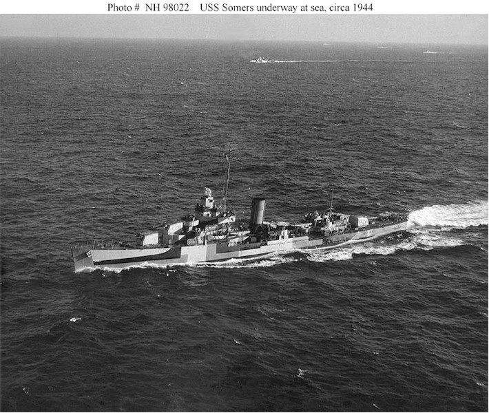 | 136k | USS Somers (DD-381) Underway at sea, circa 1944, with several escort ships (DE) in the distance. Her camouflage is Measure 32, Design 3d. Official U.S. Navy Photograph, from the collections of the Naval Historical Center. | Christopher Karwowski |