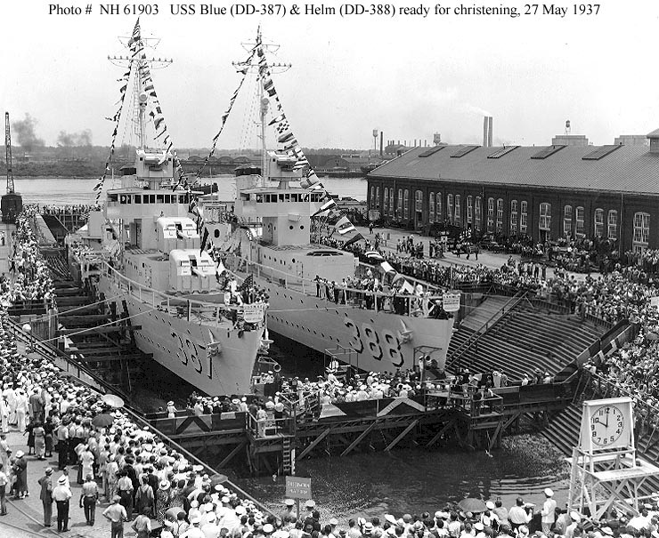| 155k | USS Blue (DD-387), left, and USS Helm (DD-388), ready for christening, in Drydock Two at the Norfolk Navy Yard, Portsmouth, Virginia, 27 May 1937. Official U.S. Navy Photograph, from the collections of the Naval Historical Center. | Joe Radigan |