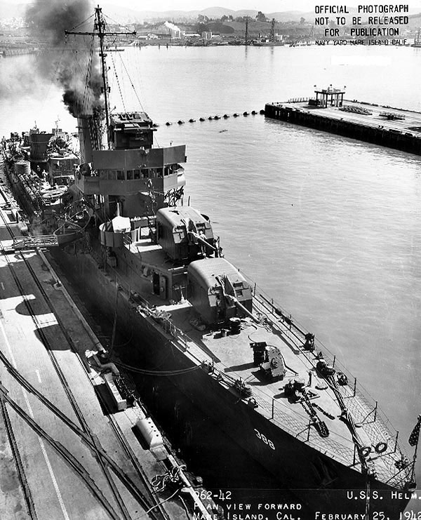 | 96k | Navy Photo 2550-44, bow on view of USS Helm (DD 388) off Mare Island on 28 April 1944. She was in overhaul at Mare Island form 4 March until 4 May 1944. Note that her MK 33 director is facing aft. The ship is painted in camouflage Measure 31, Design 1d. | Darryl Baker |