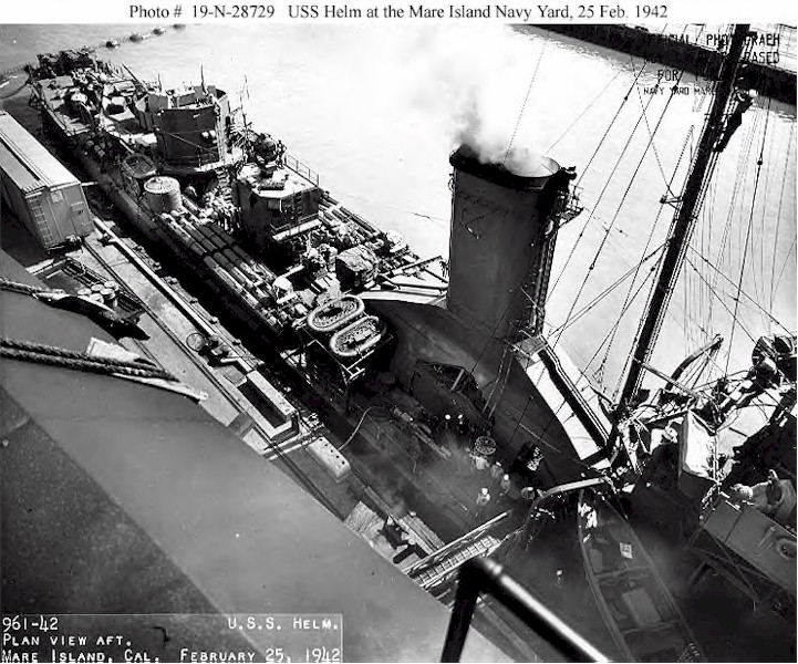 | 131k | Plan view, forward, taken at the Mare Island Navy Yard, California, on 25 February 1942. Photograph from the Bureau of Ships Collection in the U.S. National Archives. | Fred Weiss/Bill Gonyo |