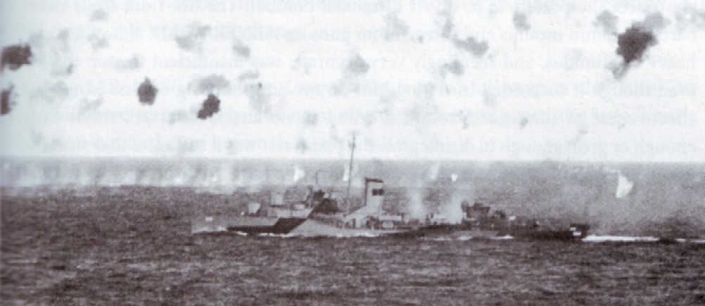 | 81k | USS Helm (DD-388) under attack on 5 January 1945 while screening an escort carrier group off Lingayen Gulf. The attacker can just be made out amidst the bursts of anti-aircraft shells direxctly above the destroyer's forward gun mounts. Photo National Archives and Records Admininstration. | Robert Hurst |