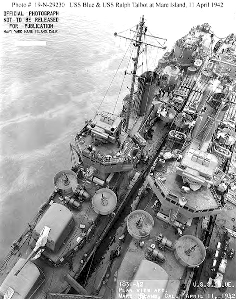 | 114k | Outboard USS Blue (DD-387) and inboard USS Ralph Talbot (DD-390) at the Mare Island Navy Yard, California, 11 April 1942. Among the details visible are: newly-installed 20mm guns; blowers mounted on deck aft of # 2 5"/38 gun; Mk. 33 gun directors atop pilothouse; radio-direction finding antennas on pilothouse face; and quadruple torpedo tubes amidships. Photograph from the Bureau of Ships Collection in the U.S. National Archives. | Fred Weiss | |
