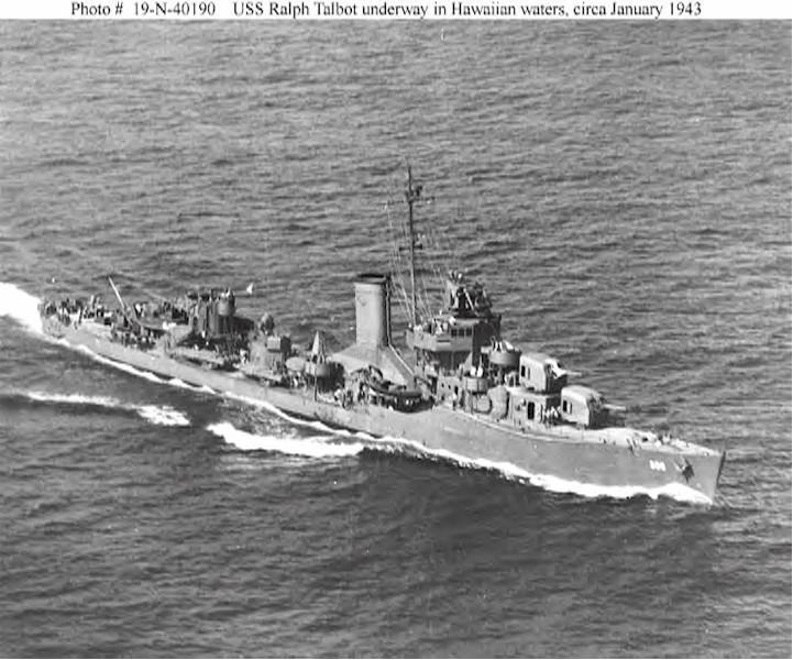 | 119k | USS Ralph Talbot (DD-390) Underway in Hawaiian waters, circa January 1943. This photograph was received by the Bureau of Ships from Pearl Harbor, with a letter of 17 January 1943. Photograph from the Bureau of Ships Collection in the U.S. National Archives. | Fred Weiss | |