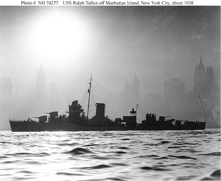 | 112k | USS Ralph Talbot (DD-390) silhouetted against the sun, while off Manhattan Island, New York City, in about 1938. U.S. Naval Historical Center Photograph. | Fred Weiss | |