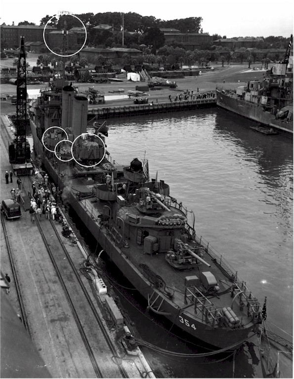 | 1140k | USS Monaghan (DD-354) at Mare Island, 13 October 1942. Note details of the early-model 5"/38 pedestal mounts aft. Circles point out modifications just made to the ship. USS Ralph Talbot (DD-390) is in the background. Source: United States National Archives, Photo No.19-N-35831. | Mike Green | |