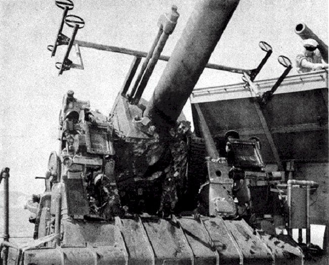 | 118k | Shell hit No. 5 on No.4 5-inch gun of the USS Ralph Talbot (DD-390). The photo shows a deep gouge in slide at point of impact and shattered elevating arc casting, from gunfire received on August 9, 1942 from Japanese cruisers during the Battle of Savo Island. Source: Navy Department Library, Destroyer Gunfire, Bomb and Kamikaze Damage Report; War Damage Report No. 51. | Mike Green | |
