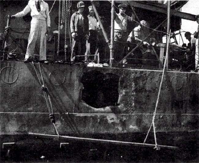 | 126k | USS Ralph Talbot (DD-390) shell hit No. 4 at Frame No. 142 received during the Battle of Savo Island. The hole is enlarged a bit from the exploding shell. Source: Navy Department Library, Destroyer Gunfire, Bomb and Kamikaze Damage Report; War Damage Report No. 51. | Mike Green | |
