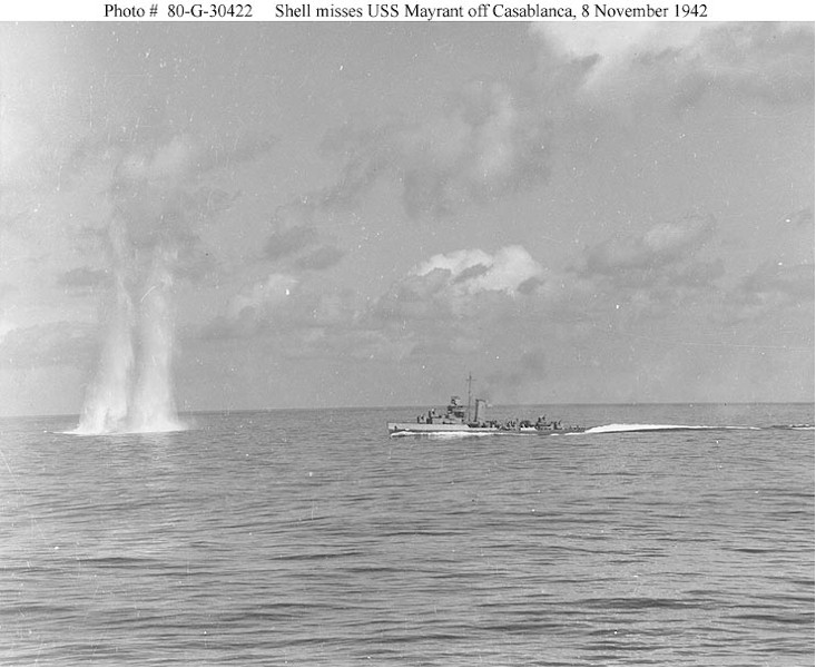 | 97k | Photo #: 80-G-30422, North African Invasion, November 1942 a salvo from the French El Hank Battery misses USS Mayrant (DD-402) during the Battle of Casablanca, 8 November 1942. Photographed from USS Augusta (CA-31). Official U.S. Navy Photograph, now in the collections of the National Archives. | Tony Cowart |
