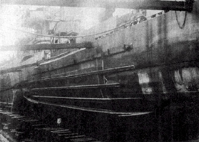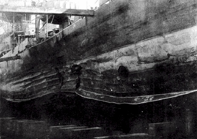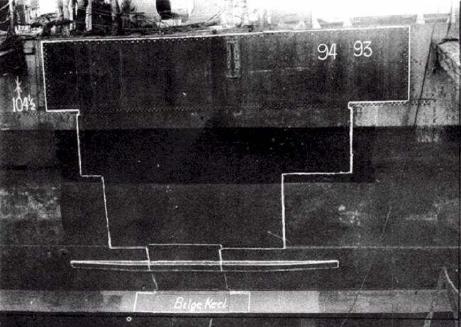 | 100k | Starboard side hull view of the amidships temporary patch installed on the USS Myrant (DD-402) at Malta. The patch is approximately double the size of the damaged hull area. Source: Navy Department Library, Destroyer Gunfire, Bomb and Kamikaze Damage Report; War Damage Report No. 51. | Mike Green |
